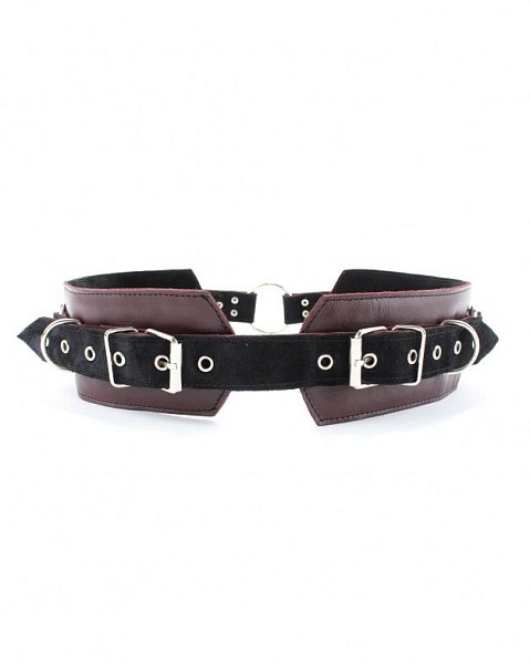 Пояс выполнен из натуральной кожи, декорирован ремнями из замши, тремя металлическими кольцами и 4 полукольцами. Сзади аксессуар надежно фиксируется пряжкой, ремни позволяют выбрать нужный размер. Мягкий подклад из замши обеспечит комфортное пребывание. Аксессуар позволяет в полной мере насладиться играми в стиле БДСМ.