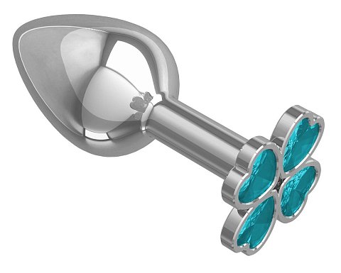 Серебристая анальная втулка с клевером из голубых кристаллов - 7 см.