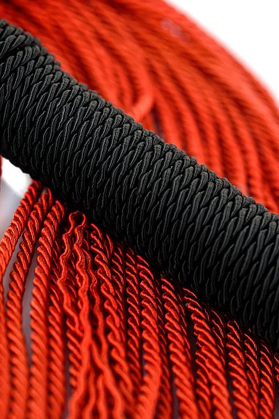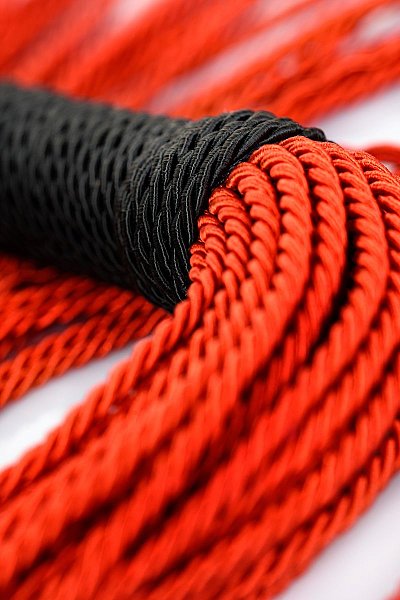 Веревочный флоггер с красными хвостами и черной плетеной ручкой мягко разогревает кожу и готовит к более серьезным воздействиям. Длина ручки - 15,5 см. Длина хвоста - 33 см.