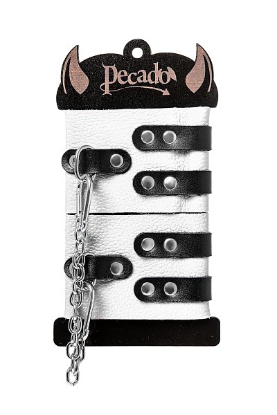 Мягкие оковы с двумя жёсткими ремешками от Pecado помогут обездвижить партнера во время сексуальных прелюдий или жестких БДСМ-играх. Оковы изготовлены полностью из белой, натуральной кожи. Ремешки выполнены из чёрной жёсткой кожи, украшены люверсами. Выделка материала произведена вручную. Ремешки и широкая манжета хорошо держат форму: не тянутся и не мнутся. Качественная металлическая фурнитура добавляет лоска изделию, а аромат натуральной кожи повышает градус возбуждения. Благодаря широкому запасу регулировок, можно подобрать необходимый обхват. Аксессуар удобно застегивать и легко расстегивать. При правильном использовании не оставляет следов на теле и не доставляет дискомфорта. Манжеты оков соединяются между собой помощью двух карабинов и съемной стальной цепочки. Подходит и для женских, и для мужских ног. Длина манжет - 25 см, ширина - 7 см. Длина сцепки - 20 см.