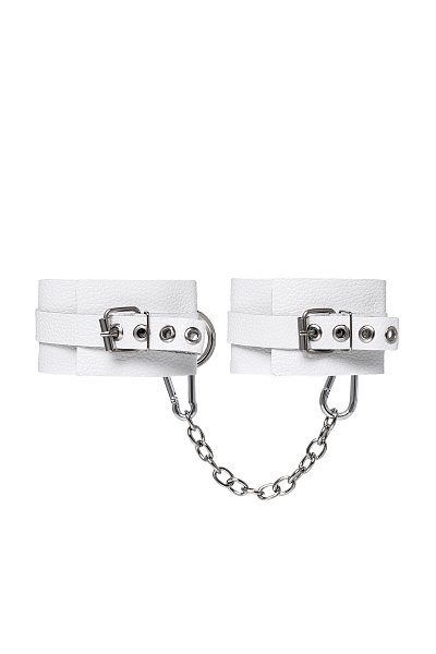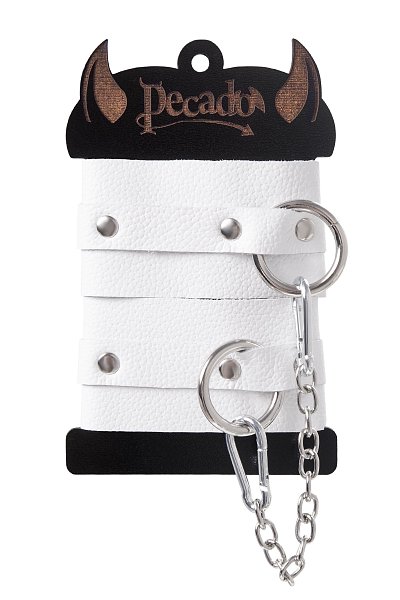 Самый мягкие оковы из всей линейки российского производителя Pecado. Сексуальный атрибут изготовлен из безопасной и натуральной кожи. Насыщенно белый цвет и терпкий аромат материала повышают градус возбуждения в процессе ролевых игр. Манжеты и ремешки девайся очень тактильно приятные. Они не мнутся, не тянутся и обладают повышенной износостойкостью. Вся фурнитура высокого качества. На тонких ремешках имеются отверстия с люверсами, для подбора нужного обхвата. Благодаря стальной застежке аксессуар легко застегивается и расстегивается. Между собой оковы присоединяются с помощью карабинов и короткой цепочки. Длина манжет – 25 см, ширина - 5,5 см. Длина сцепки – 24 см.