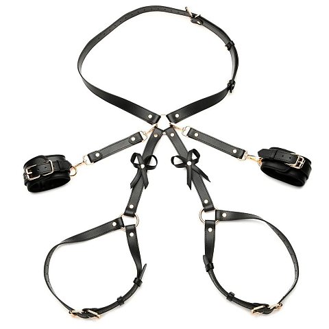 Очаровательные аксессуары для сексуальных игр и украшения своего партнера. Набедренная сбруя выполнена из мягкой экокожи и украшена бантиками. От поясной части идут перемычки, которые сковывают движения рук, если присоединить к ним наручи из комплекта.