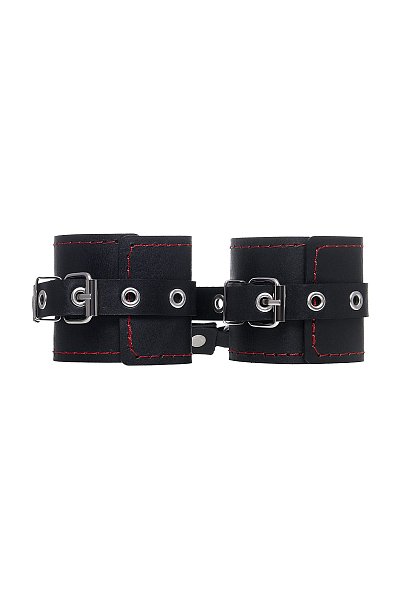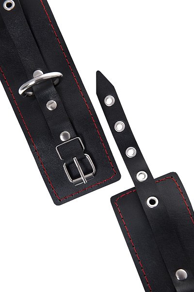 Однослойные кожаные наручники с контрастной строчкой красного цвета могут стать стильным аксессуаром на «свободных» руках, но могут послужить вашим целям и фантазиям по своему прямому назначению.