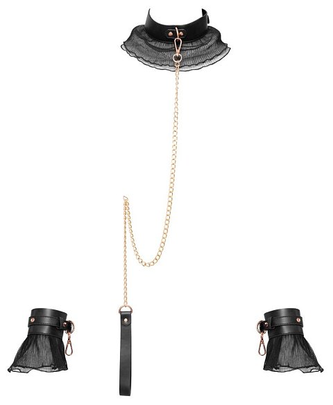Качественный бондажный комплект от Bad Kitty состоит из ошейника с поводком и наручников. Они выполнены в реалистичном кожаном стиле с изящными плиссированными оборками и металлическими элементами золотистого цвета. Все ограничители удобные и их можно регулировать. Каждый наручник имеет кольцо и карабин. Ошейник с кольцом имеет съемный поводок-цепочку с карабином и ручную петлю.