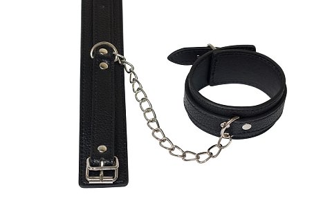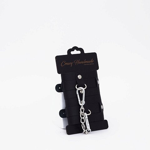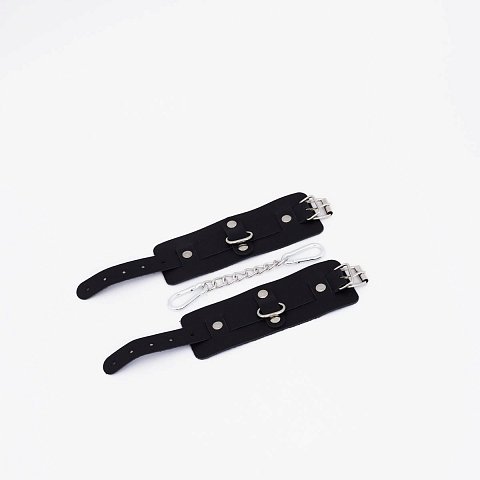 Кожаные наручники в красно-черной гамме. Украшены заклепками и соединяются между собой цепью с карабинами. Размер наручников регулируется при помощи застежки-липучки. Подойдут на обхват руки от 15 до 20 см. Ширина - 5 см.