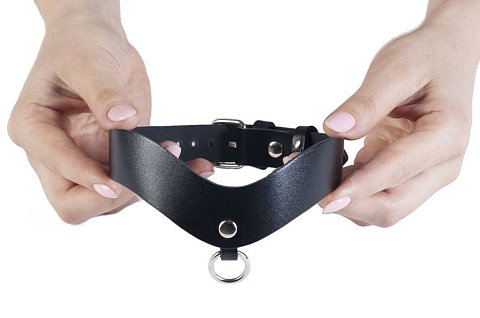 Ошейник стильной формы, представляет собой единый отрез натуральной кожи с металлическим кольцом для поводка в центре.