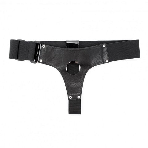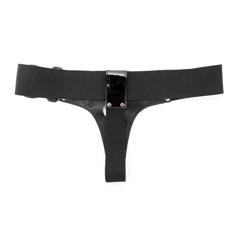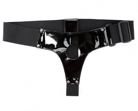 Трусики выполнены из лакированного кожзама черного цвета с элементами из черных эластичных резинок, надежно фиксирующих изделие на теле. Размер удобно регулируется, подойдет на 42-46. Максимально комфортный аксессуар разнообразит любую БДСМ игру. Диаметр отверстия для страпона - 4 см. Ширина резинки на поясе - 5 см.