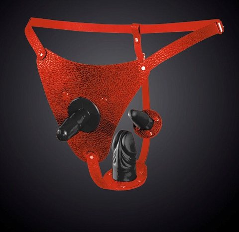 Красные кожаные трусики со штырьком и двумя съёмными стимуляторами
