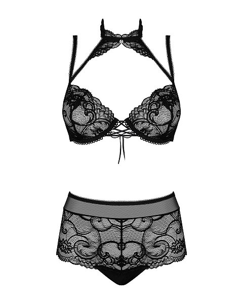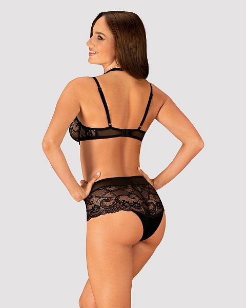 Комплект белья из коллекции Elizenes из гипюра и вуали: бюстгальтер мягкий на косточках, тонкие бретели регулируются по длине, на спине застежка-удлинитель, между чашек шнуровка. В зоне декольте бретели соединяются с кружевным чокером, на шее застёжка. Трусики-панти с высокой линией талии. В комплекте: бюстгальтер, трусики.