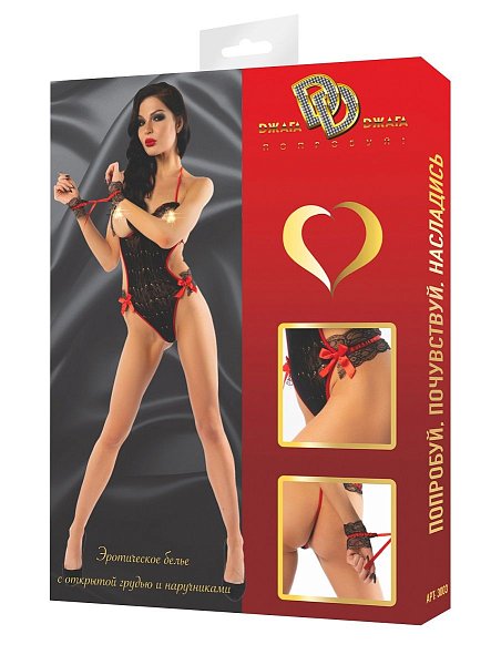Боди — особая эротическая одежда, помогающая создать романтичный настрой и заинтересовать партнера во время интимных игр. Боди облегает тело, подчеркивая сексуальные изгибы, при этом он не мешает движениям и выгодно демонстрирует прелести фигуры. Эротическое белье больше показывает, чем скрывает, и все же оно оставляет простор для мужской фантазии и любопытства. Откровенное кружевное боди с открытой грудью даст вам возможность продемонстрировать свои прелести в наиболее волнующем ракурсе. Объемные кружевные рюши и цветочный орнамент сделают акцент на самых соблазнительных частях тела. Кружевные наручники на завязках дополняют образ роковой красотки. В комплекте: боди, наручники.