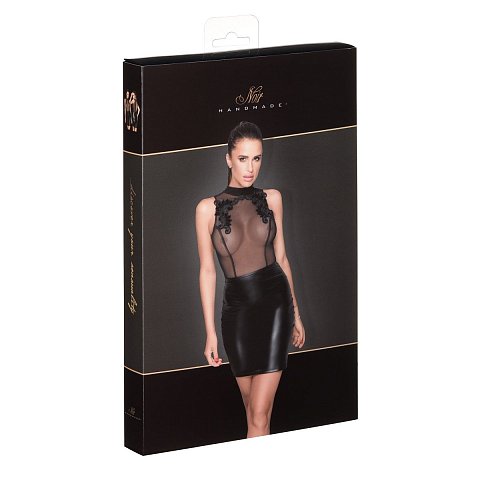 Платье без рукавов с элегантной вышивкой и игривой декоративной строчкой. Верхняя часть выполнена из мягкого фатина и имеет очаровательный вырез на спине, где застегивается на две маленькие пуговицы. Юбка изготовлена из великолепного эластичного материала wet-look и имеет небольшой разрез сзади.