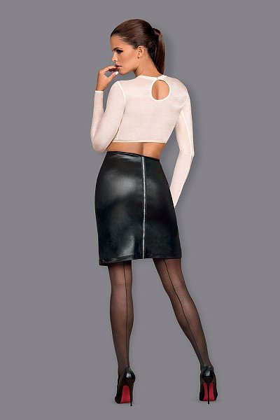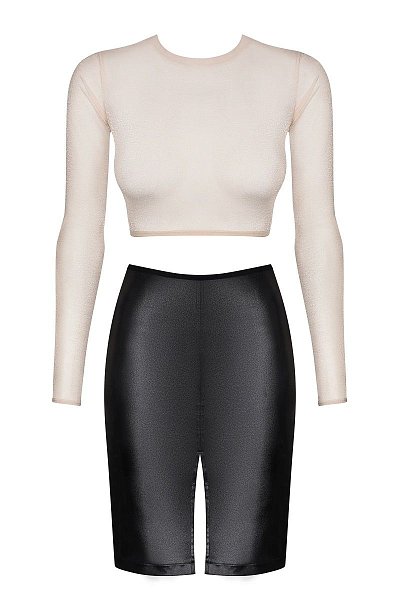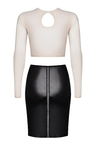 Эффектный костюм босса состоит из двух частей. Укороченная блуза облегающего кроя с оригинальным вырезом на спине и с длинными рукавами. Юбка из эластичного материала, имитирующего кожу, спереди глубокий разрез, сзади декоративная молния. В комплекте: блуза, юбка.