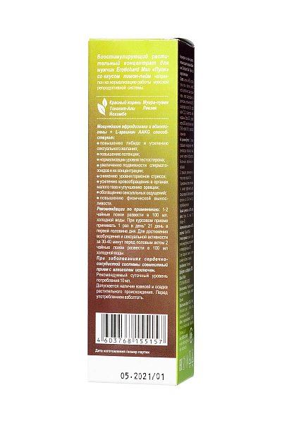 Для мужчин важно оставаться сексуально активными, здоровыми и выносливыми в любом возрасте. Биостимулирующий растительный жидкий концентрат Erotic hard Man Пуля со вкусом лимона и лайма разработан специально для мужчин. За счет натуральных растительных компонентов в составе, Erotic hard Man Пуля оказывает положительный эффект на работу всех основных систем организма. А мощные природные афродизиаки, усиленные L-аргинином AAKG, благотворно воздействуют на половую функцию.
