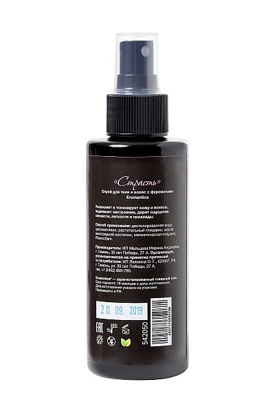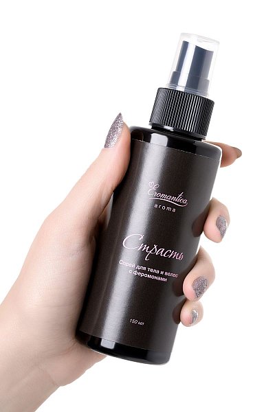Манит, соблазняет…. С новым спреем из коллекции Eromantica Aroma «Страсть» ты станешь особенно привлекательной в глазах окружающих и почувствуешь уверенность в любой компании, благодаря природным феромонам и аромату, гарантирующему море желания и страсти... Освежает, увлажняет лицо, тело и волосы. Оставляет шлейф аромата терпких объятий и страстных свиданий.