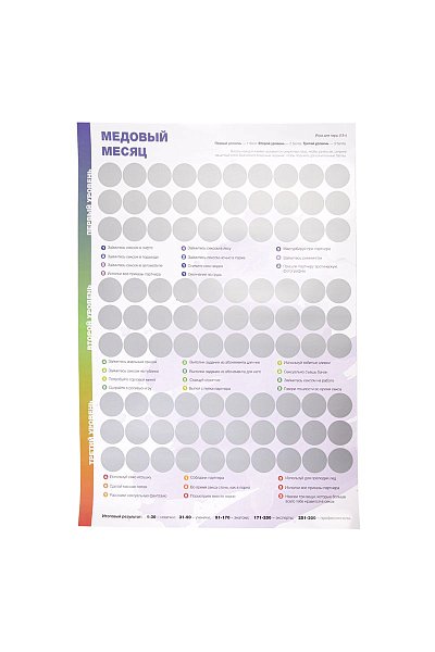 Специальный скретч-плакат содержит 90 эротических поз, 3 уровня сложности и 32 бонусных задания. Выполняйте задания и набирайте максимальное количество баллов, чтобы пройти путь от новичков к профессионалам.