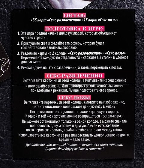«Секс-развлечения». Вытягивайте карточки из этой колоды, зачитывайте их содержание и воплощайте его в жизнь. Для некоторых развлечений вам может понадобиться реквизит. Лучше подготовить его заранее.