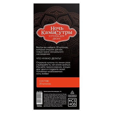Внутри вы найдёте купоны с подробным и горячим описанием сексуальных поз, которые откроют вам новые грани получения удовольствия. Отрывайте горячий купон, вручайте его второй половинке и предвкушайте самую бурную ночь в своей жизни! В набор входят 20 купонов.