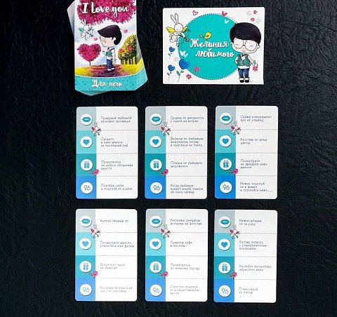 Этот набор позволит вам окунуться в сладкие моменты нежности, заботы и поцелуев. Каждый должен загадать заветное желание (главное, чтобы оно было выполнимо), записать его на листочке и сложить в специальный конверт. Игра началась!