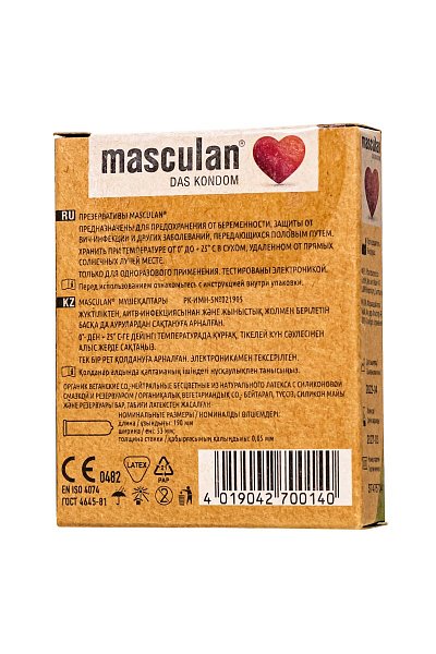 Masculan – это презервативы премиум-класса, разработанные в Германии с соблюдением высочайших стандартов качества и дизайна. Немецкое производство, высококачественное сырье, и электронное 6 ступенчатое тестирование каждого презерватива обеспечивают безопасность и надежность. Внешняя упаковка сделана из вторсырья и не содержит полиэтилен, а внутренняя фольга содержит в 2 раза больше алюминия.