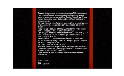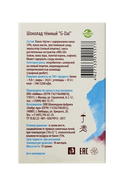 В составе шоколада G-Dai - темный шоколад Barry Callebaut (содержание какао 54%) и комплекс растительных экстрактов iMix GD. В этом шоколаде применена новая формула сочетания активных веществ, благодаря которой удалось добиться не только последовательного и пролонгированного действия афродизиаков, но и избирательности воздействия на мужчину и женщину. Кроме того, данный купаж афродизиаков наиболее гармонично сочетается со вкусом бельгийского шоколада.