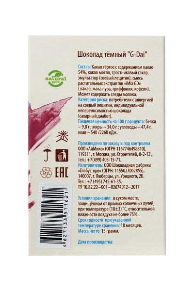 В составе шоколада G-Dai - темный шоколад Barry Callebaut (содержание какао 54%) и комплекс растительных экстрактов iMix GD. В этом шоколаде применена новая формула сочетания активных веществ, благодаря которой удалось добиться не только последовательного и пролонгированного действия афродизиаков, но и избирательности воздействия на мужчину и женщину. Кроме того, данный купаж афродизиаков наиболее гармонично сочетается со вкусом бельгийского шоколада.