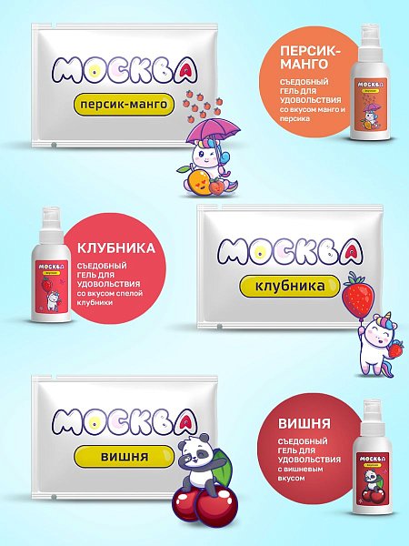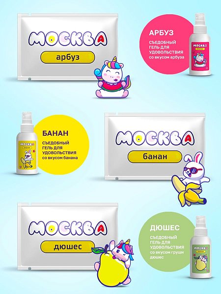 В наборе 9 удобных саше с ароматами: соленой карамели, шоколада, пломбира, клубники, персика-манго, арбуза, банана, вишни, дюшеса. А также 2 саше для классического и анального секса: Влажная на водной основе и Скользкая на силиконовой основе