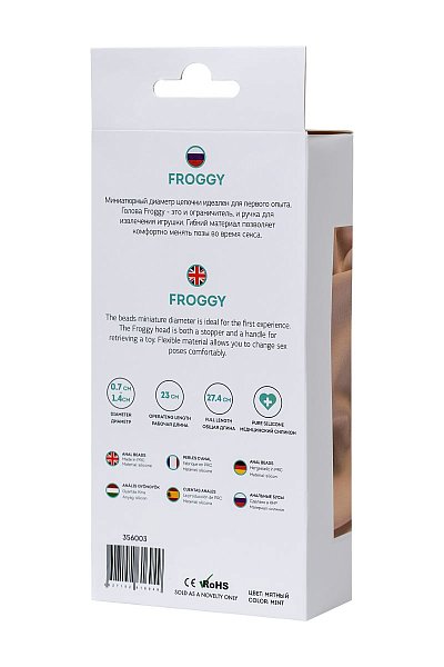 Миниатюрный диаметр цепочки идеален для первого опыта. Голова Froggy — это и ограничитель, и ручка для извлечения игрушки. Гибкий материал позволяет комфортно менять позы во время секса. Рабочая длина - 23 см. Минимальный диаметр - 0,7 см.