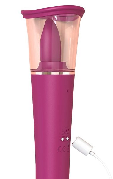 Отзывы о Малиновый двусторонний вибратор с вакуумной помпой и подвижным язычком - 26,7 см.