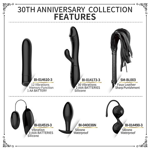 Подарочный вибронабор из 6 предметов. В набор входит силиконовый вибратор-кролик с 30 режимами вибрации, классический вибратор с 12 режимами вибрации, двойные вагинальные шарики из силикона, силиконовое мультискоростное виброяйцо, силиконовая анальная пробка без вибрации и плеть из эко-кожи. Батарейки не входят в комплект (необходимо приобрести 5 штук типа ААА и 1 штуку типа АА). Длина вибратора-кролика - 19,5 см, диаметр - 3,2 см. Длина классического вибратора - 12,4 см, диаметр - 2,7 см. Длина вагинальный шариков - 16,3 см., диаметр - 3,3 см. Длина виброяйца - 6,9 см, диаметр - 3,7 см. Длина анальной пробки - 8,5 см, диаметр - 3,1 см. Длина плети - 40 см.