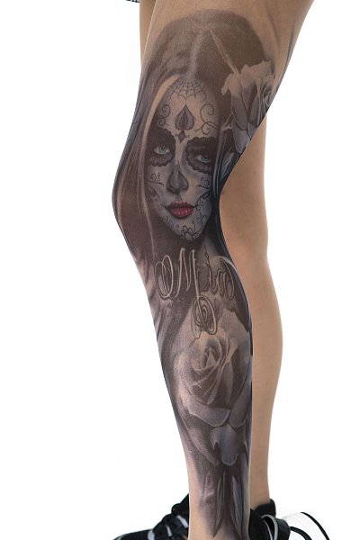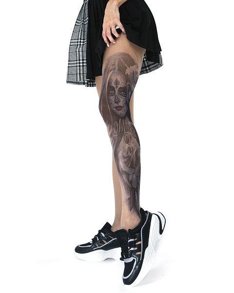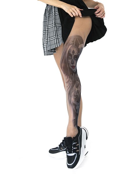 Колготки +size с крупным принтом-тату в виде девушки с макияжем калавера