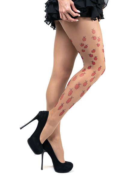 Колготки с принтом в виде божьих коровок на правой ножке. Принт не стирается, не выгорает со временем. Можно стирать в стиральной машине. Крепкие, подойдут на рост от 145 до 180 см. Плотность - 40 ден.