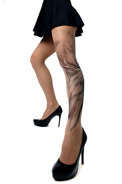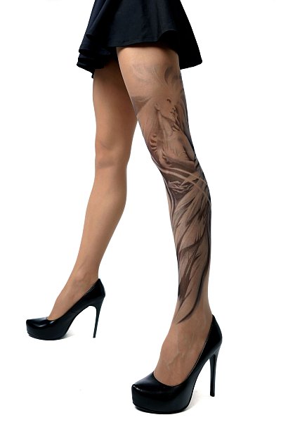 Колготки с принтом в виде девушки в объятьях ангела. Принт не стирается, не выгорает со временем. Можно стирать в стиральной машине. Крепкие, подойдут на рост от 145 до 180 см. Плотность - 40 ден.