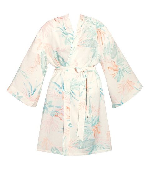 Пеньюар на запах, с короткими рукавами, полочки до талии и рукава украшены кружевом. Пояс в комплекте.