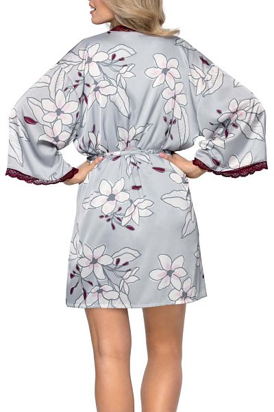 Короткий халат–кимоно выполнен из тканной принтованной вискозы в сочетании с изысканным кружевом. Рукава 3/4, низ рукавов изящно декорирован роскошной вышивкой на тюле. Борта халата украшены тонкими кантами. В комплекте пояс с кисточками.
