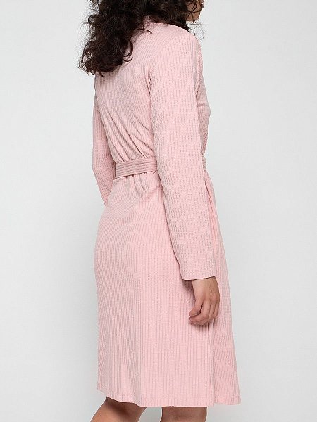 Халат из искусственного однотонного шелка, длиной ниже линии колена ,прямого силуэта, свободной формы, с запахом под пояс. Рукав рубашечный, расширен к низу, длиной длиной три четверти. Линия горловины и низ рукавов декорированы ажурным нежным кружевом, в боковых швах закругленные разрезы.