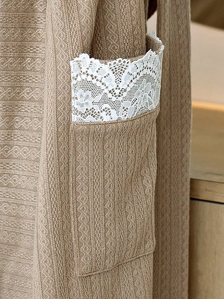 Женский домашний халат из мягкого трикотажного полотна с фактурным узором из полосок с косичками. Модель с длинным рукавом на запах, с мягким поясом, с накладными карманами, классической и универсальной длины миди. Романтичный и женственный акцент – кружевная отделка кокетки и карманов.