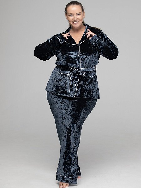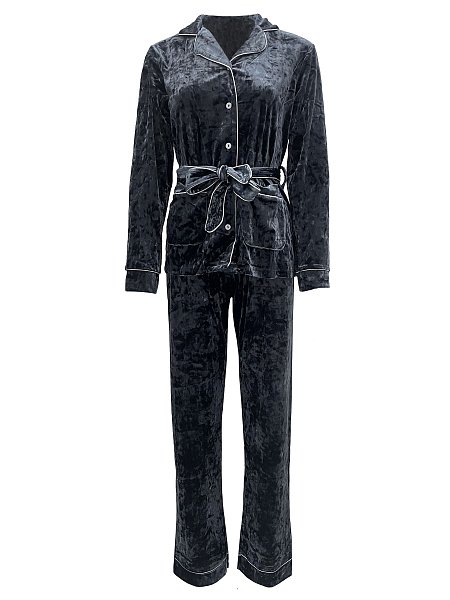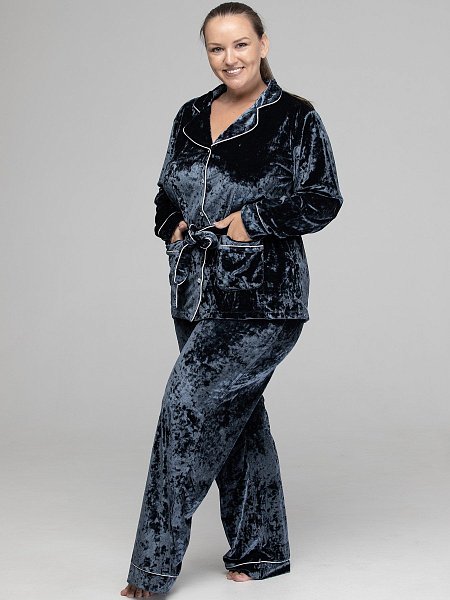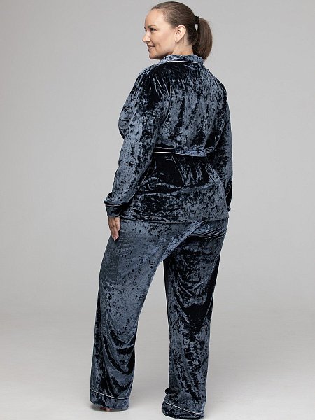 Королевский бархатный костюм насыщенного серого цвета: жакет и брюки. Особенно изысканно этот цвет смотрится в сочетании с белым атласным кантом, который присутствует в отделке костюма, и перламутровыми пуговицами. Брюки прямого силуэта, на резинке. Жакет с английским отложным воротником, накладными карманами, мягким поясом. В комплекте: жакет, брюки.