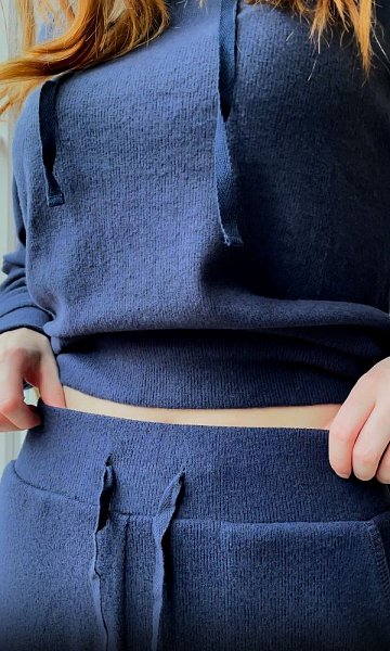 Женский костюм для дома и отдыха – худи и джоггеры. Мягкий трикотаж, визуально и тактильно аналогичный кашемиру, окунает Вас в океан безмятежности и комфорта. Брюки с карманами, на манжетах. Худи имеет кулиску в капюшоне. Рукава-реглан, на манжетах. Приглушенный темно-синий цвет выглядит благородно и дорого. В комплекте: худи, джоггеры.