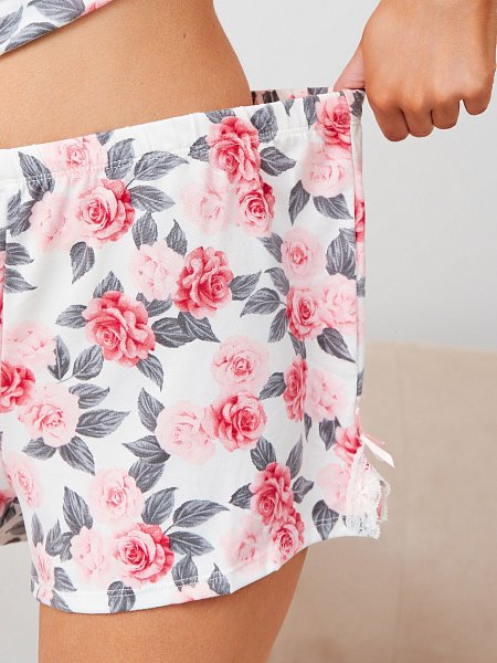 Комфортный комплект для дома и сна: топ на регулируемых бретелях и свободные шортики на резинке. Пижама мягкая, легкая, украшена кружевом и нежным рисунком роз. Практичная в уходе: не выцветает и сохраняет цвет и форму после многочисленных машинных стирок. В комплекте: топ, шорты.