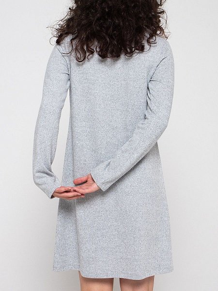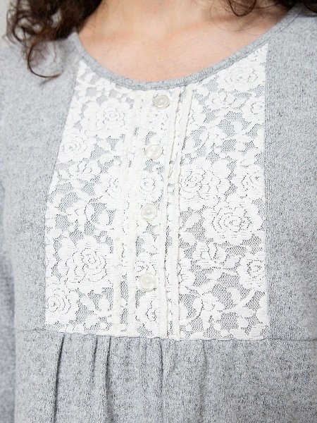 Теплое домашнее платье-сорочка из мягкого трикотажа с небольшим ворсом. Чуть расклешенный силуэт, отрезное под грудью, длинный рукав. Круглый вырез горловины дополняет милая кружевная вставка на груди, украшенная перламутровыми пуговками. Незаменимая вещь в загородном доме в холодную погоду, обеспечивающая уют и комфорт.