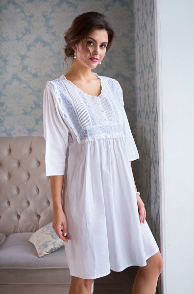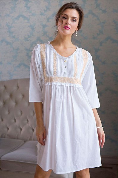 Хлопковая сорочка средней длины с широким рукавом 3/4 и декором в виде вышивки по лифу. Горловина декорирована узкой рюшей. На полочке расположена застежка-планка на перламутровых пуговицах. По лифу расположены вертикальные отсроченные защипы и ленты с вышивкой. По боковым швам и талии лиф оформлен узкой рюшей. Юбка на защипах по уровню талии.