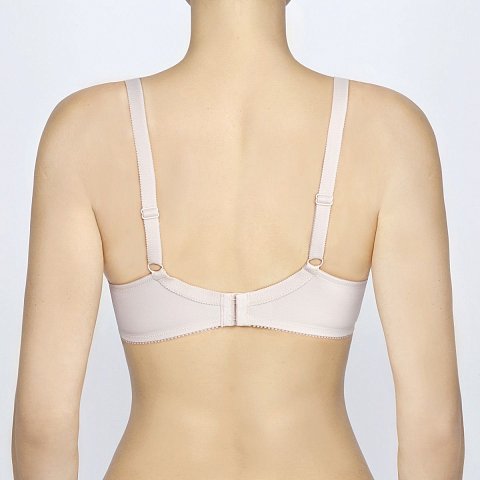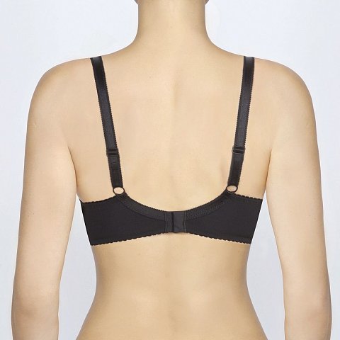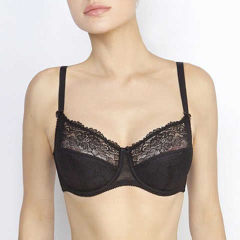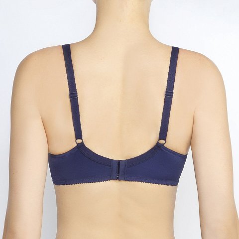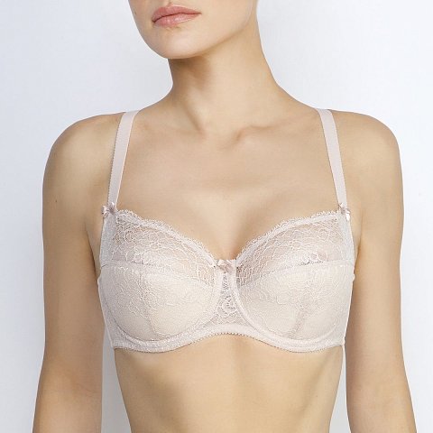 Бюстгальтер-балконет с полудублированной поролоном чашкой, на каркасах. Выполнен из неэластичного кружевного полотна. Внутренняя боковая часть чашки, усилена неэластичной тканью «в сгиб», без дополнительных швов для комфортности. Именно этот элемент позволяет не растягиваться ткани в подмышечной зоне. Бочек отрезной. Кружевное полотно на боковой детали дополнительно дублировано стабильным, не эластичным полотном, для дополнительной поддержки. Боковая косточка не дает ткани «скрутиться» на больших размерах. Бретель классическая, предназначенная для большой размерной группы. Бюстгальтер декорирован лаконичными бантиками.