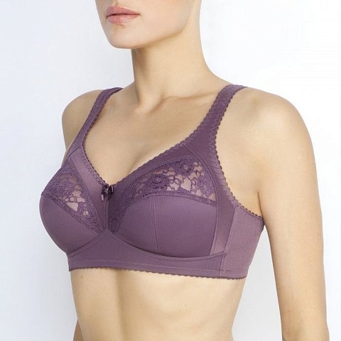 Классический бескаркасный бюстгальтер с мягкой чашкой, для большой полнотной группы. Нижняя часть чашек и пояс спереди ламинированы хлопком, что придает стабильность и комфорт, как поддерживая грудь, так и улучшая гигроскопичность при носке. Внутренние швы обработаны мягкой отделочной тесьмой, что позволяет швам не натирать чувствительную кожу. Для комфорта, и в то же время придания легкости и ажурности бюстгальтера, не эластичное кружевное и стабильное полотно, продублировано прозрачной сеткой. Поддерживающий элемент подмышечной зоны с выходом на бретель оформлен с расширением на плече и дополнительно продублирован поролоном. Вертикальные косточки на боковых панелях, не дают ткани скрутиться на больших размерах.