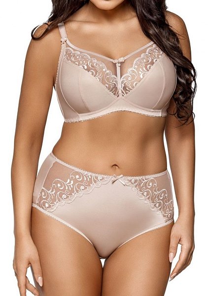 Бюстгальтер с мягкими чашечками без косточек, с дополнительными боковыми поддержками. Чашки шитые, из эластичной ткани и сетки с вышивкой, Бретельки регулируются по длине, не отстёгиваются. На спине застёжка на удлинитель, количество крючков в ряду застёжки увеличивается пропорционально размеру бюстгальтера, от 1 до 3 крючков.