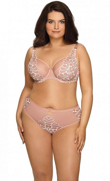 Бюстгальтер с мягкими открытыми чашками на узком соединении, на каркасах. Чашка с вертикальным швом выполнена из кружева, на подкладке из ткани в сетку. Бретели с фестончатым краем регулируются на спинке.