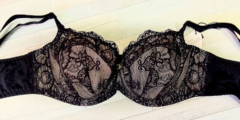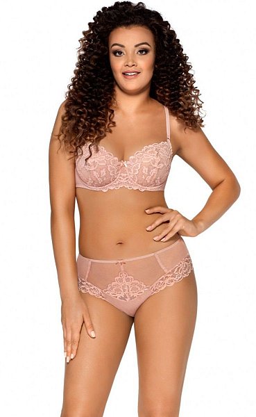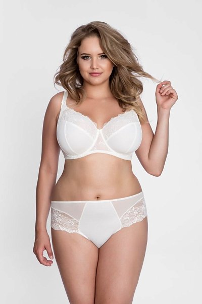 Бюстгальтер выполнен на косточках, чашки мягкие, шитые из гладкого трикотажа и сетки телесного цвета с вышивкой, спинка гладкая, бретельки не отстёгиваются, регулируются по длине. На спине застёжка на удлинитель, количество крючков в ряду застёжки увеличивается пропорционально размеру бюстгальтера.