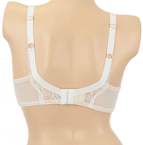 Бюстгальтер Fiore PU на косточках, с дополнительными боковыми поддержками, чашки шитые, нижняя часть на тонком поролоне телесного цвета, внутренняя сторона проложена хлопковым трикотажем, снаружи покрыта кружевом, верхняя часть кружевная. Бретельки не отстёгиваются, регулируются по длине. На спине застёжка на удлинитель, количество крючков в ряду застёжки увеличивается пропорционально размеру бюстгальтера, фурнитура цвета меди.