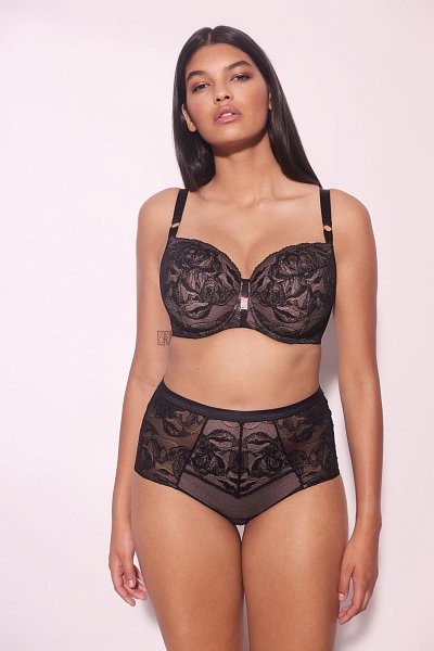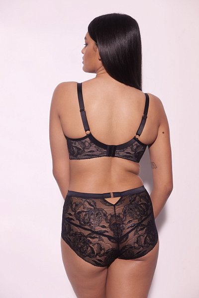 Бюстгальтер Frozen Black PU выполнен на косточках, с дополнительными боковыми поддержками, чашки шитые, нижняя часть на тонком поролоне телесного цвета, внешняя сторона и верхняя покрыты нежным кружевом с черными цветами, с эффектом мерцания. Спинка из кружева продублирована телесной сеткой. Бретельки с эффектом мерцания не отстёгиваются, регулируются по длине. На спине застёжка на удлинитель, фурнитура металлическая цвета меди.