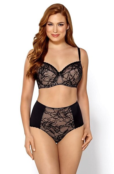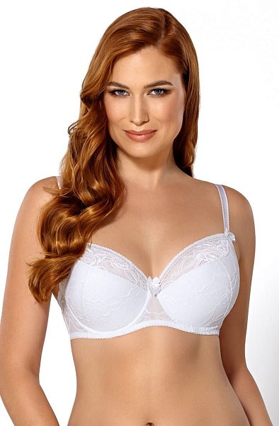 Бюстгальтер Tatiana PU, чашки шитые, на косточках, нижняя часть на тонком поролоне, верхняя из гипюра, продублированного сеткой, внутри чашечки проложены хлопковым трикотажем. Бретельки пришиты, регулируются по длине. На спине застёжка на удлинитель, количество крючков в ряду застёжки увеличивается пропорционально размеру бюстгальтера.
