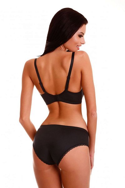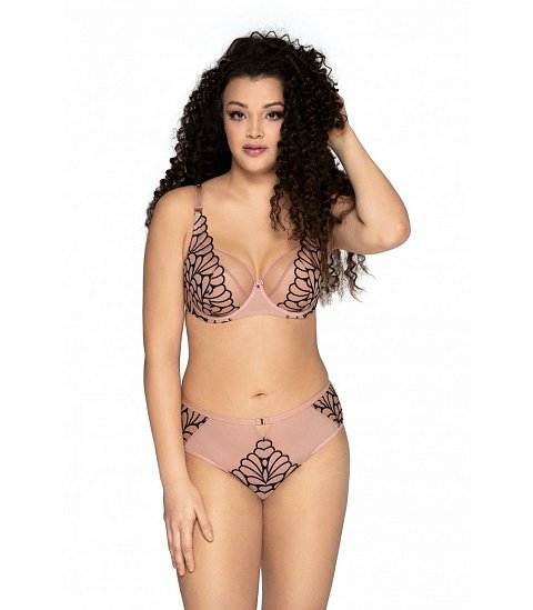 Бюстгальтер Vulcano PU на косточках, с дополнительными боковыми поддержками, чашки шитые, нижняя часть на тонком поролоне телесного цвета, внутренняя сторона проложена хлопковым трикотажем, снаружи покрыта серо-бежевым кружевом, верхняя часть кружевная. Бретельки не отстёгиваются, регулируются по длине. На спине застёжка на удлинитель, количество крючков в ряду застёжки увеличивается пропорционально размеру бюстгальтера. Фурнитура цвета меди.